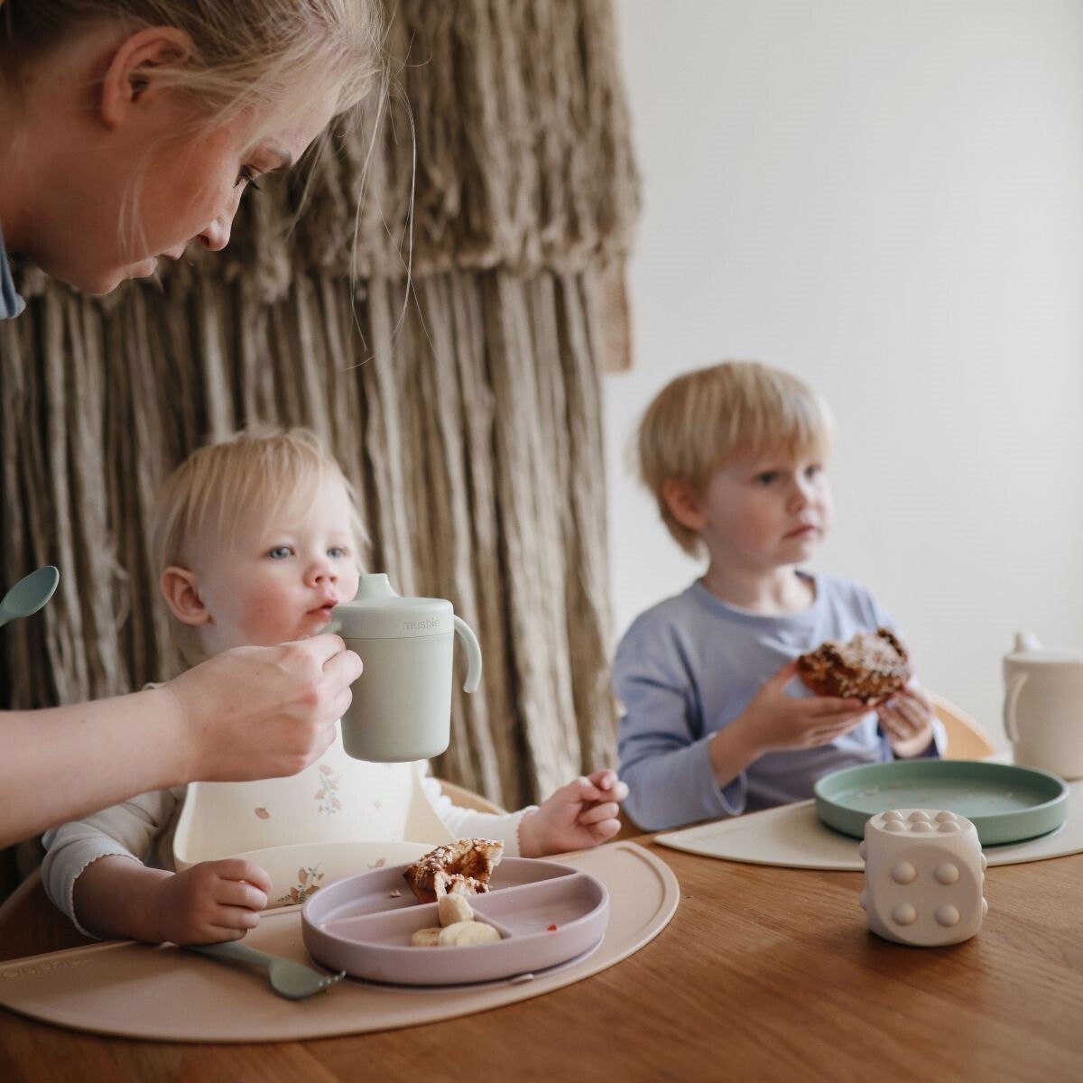 Deze bekers zijn ontworpen in Denemarken van polypropyleen plastic en zijn vaatwasmachine- en magnetronbestendig. Terwijl de handvatten ervoor zorgen dat kleine handjes makkelijk kunnen pakken om zelf te drinken als ze dorst hebben, kun je met het afneembare deksel zorgeloos bijvullen.